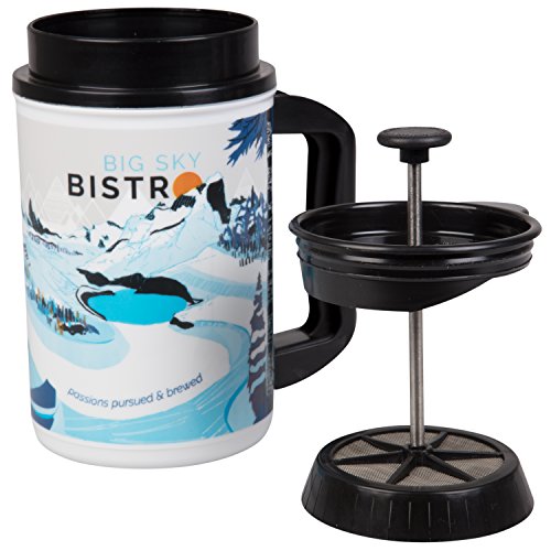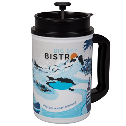 The original Big Sky Bistro French Press Travel Mug, designed with durability and portability in mind, to help you make the perfect cup of coffee or tea wherever your adventures take you. Redesigned with an improved French press plunger design and updated graphics, the Big Sky Bistro by Planetary Design maintains all the great features that made you fall in love with the original version released 25 years ago. It's back and better than ever. Durable? Check. Lightweight? Check. Portable and functional? Check and check! Designed in Missoula, Montana by people who take their coffee as seriously as the places their coffee takes them, the Big Sky Bistro is just as comfortable on your office desk as it is on the tailgate of your pickup truck. Insulated, BPA-free hard plastic construction ensures that your beverage of choice stays warmer longer without breaking the bank. It is durable enough to emerge unscathed from any unintentional falls, and its built-in French press plunger means no more suffering through those little packets of instant coffee. For those that demand the best, we created the Big Sky Bistro French Press Mug. Available in 3 styles. Hand wash recommended. Do not microwave. Recycleable body. 16 fl. oz. capacity. Measures: 7"hFeature