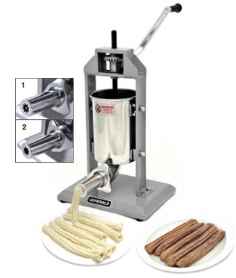 Stainless steel cylinder. Base plate is made of sturdy gauge material. 1-Gear system. Comes with 2 different stainless steel nozzle adapters. One for filling (hollow) and the other is for plain churros. Designed for both commercial and home use. Portable and easy to operate. Easy to clean. Capacity: 5 lbs. Dimension: 11.75 x 8.75 x 18.5.Feature