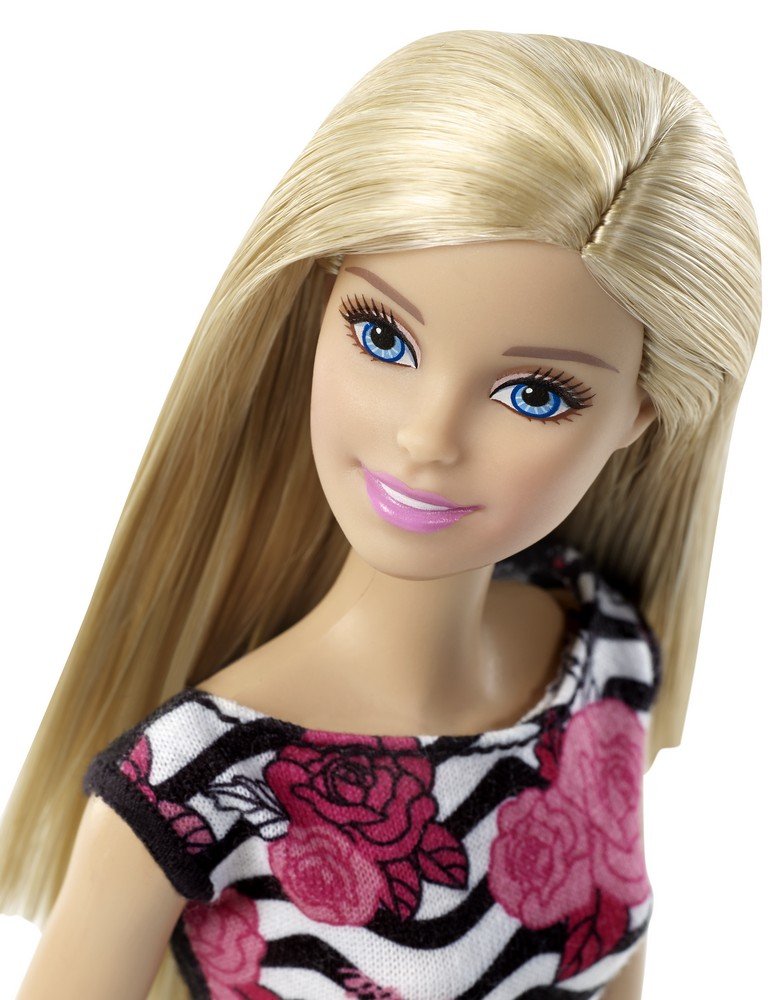 Barbie Pink-Tastic Doll Rose Art On Black & White Stripes Dress