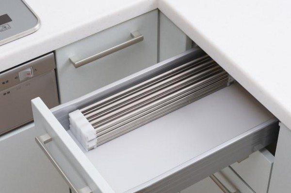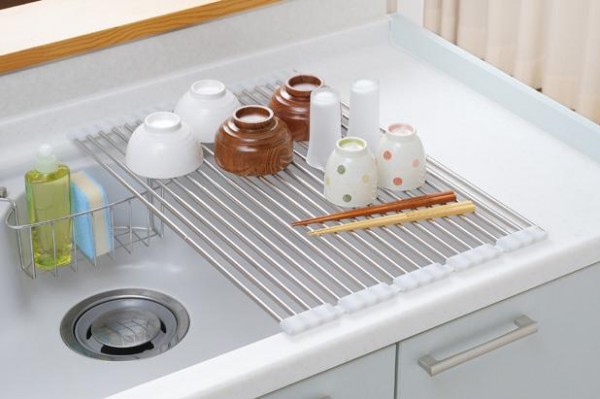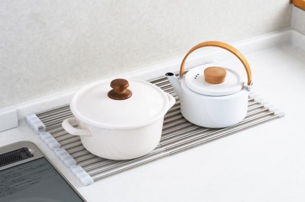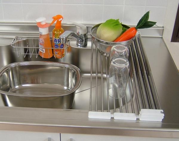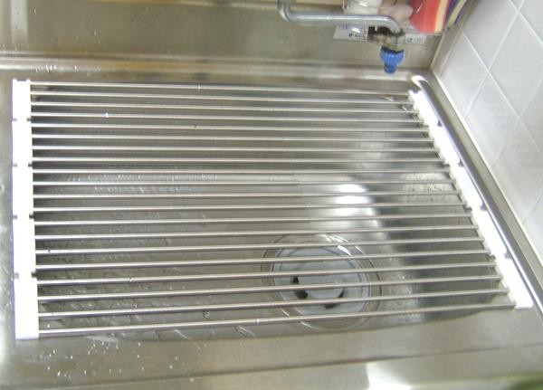 | 広げてスッキリ水切り、大型鍋もラクラク置けます。使用に応じてたたんだり広げたり調節できます。食洗機で洗えない大型鍋やフライパンなどの水切り、少量の洗い物にも便利です。コンパクトシンク(W550mmタイプ)にぴったりの長さで、シンク全面に使用することもできます。 |