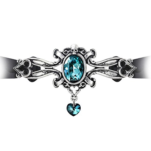 The once almighty power of the Doge of Venice was coming to an end, with the Doge himself, slipping from life. From the rich regalia of office, here is a last token of forlorn devotion to the bereaved Renaissance Lady of the Palace. This pewter choker is styled amoungst Baroque scrollwork, set with a large Swarovski crystal and with a matching crystal heart dropper, on a black satin velvet hand-tie ribbon. Materials: Fine English Pewter Casting with Swarovski crystals. Black velvet hand tied ribbon, for tying-off at your own length. Dimensions: 0.43"D x 3.46"W x 1.97"H.Feature