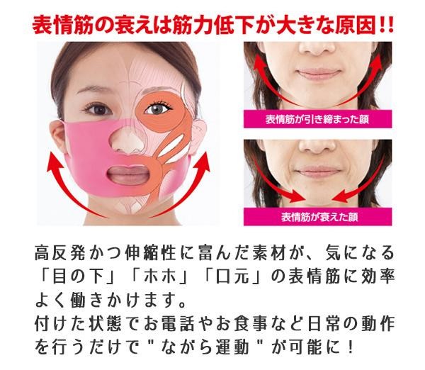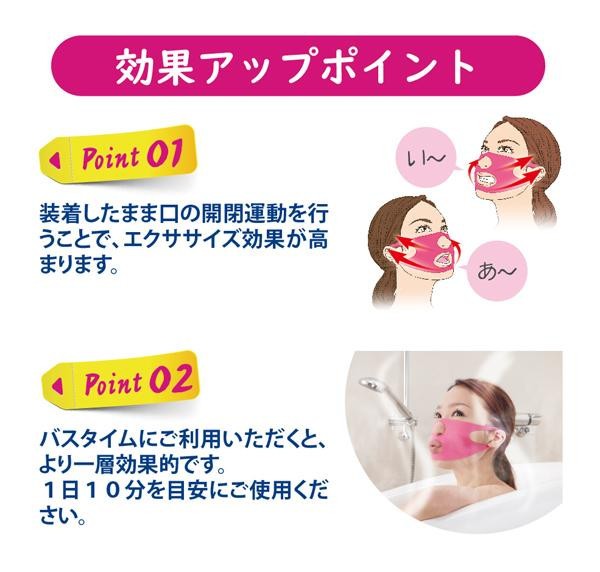 | 伸縮性の高い特殊ゲルが、気になる「頬」「口元」の表情筋に効率よく働きかけます。お風呂で使えば発汗効果もプラス!!たるんだフェイスラインをググッと引き上げます。 |