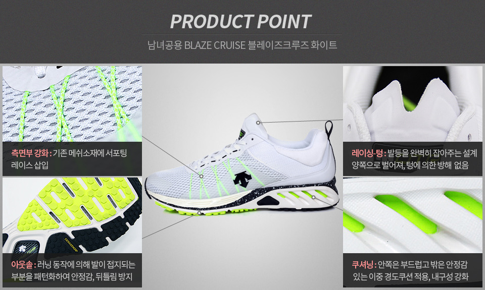 -끈 부분이 양쪽으로 벌어져 있어, 러닝시 텅에 의한 방해가 없도록 함