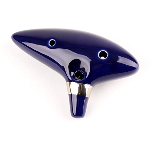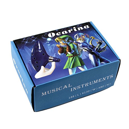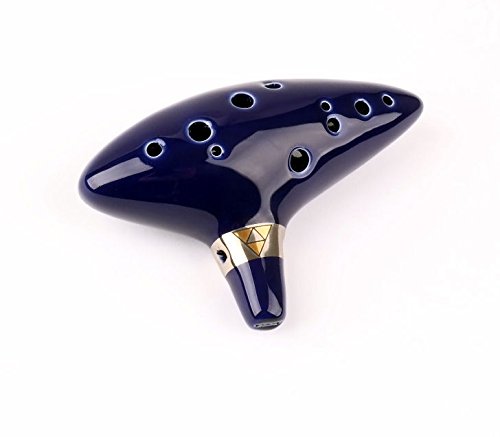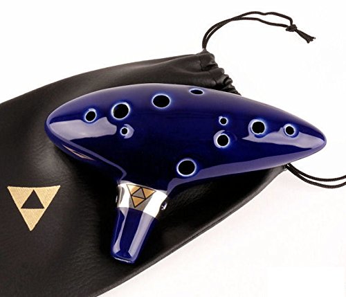 Studio : Harmon Music Publisher : Harmon Music Product Description Legend of Zelda Ocarina Of Time Deluxe Outfit Beautiful hand-crafted?12 hole ocarina made?from high quality kiln-fired ceramic. ?Ocarina is a gorgeous dark cobalt blue with a silver band and gold triforce logo. It measures 6" long. Also included?is a black leatherette carrying bag with a golden triforce logo embedded. 0