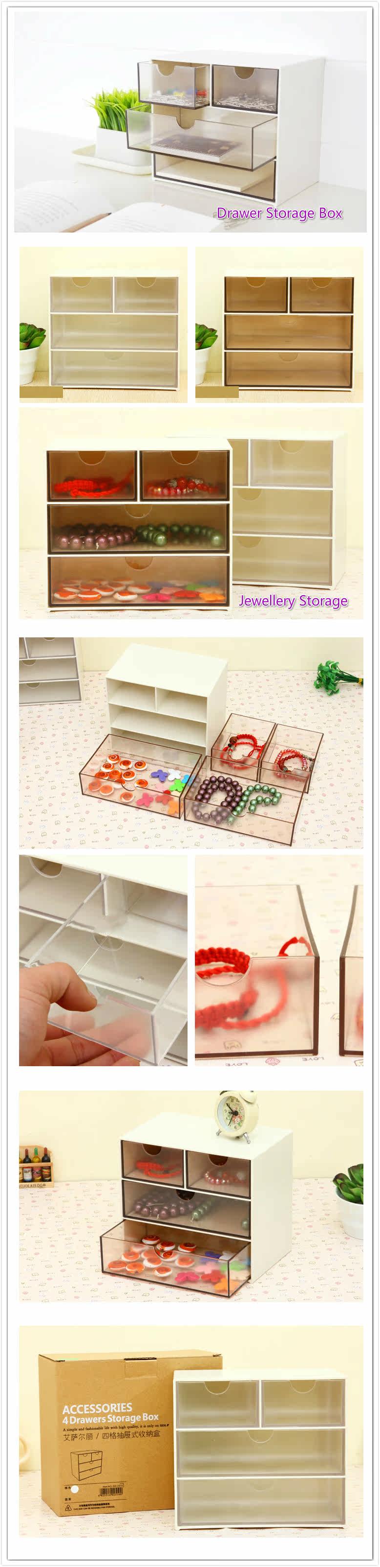three layers Four lattice jewelry drawer storage cabinets Desktopplastic storage box : for accessories classified storage, cleansimplicity. Solid color quality plastic material, two largedrawers, two small drawers to meet different needs. Each drawer hasa curved small opening, storage earrings, necklaces,trinkets.Transparent drawers, use the marker pen You can be paintedon the lovely face.