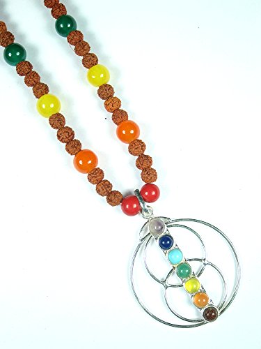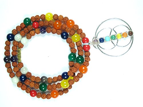 - Feature : Seven Chakras stone (amethyst, lapis, turquoise, green aventurine, yellow aventurine, red aventurine, and red jasper) in eastern spiritual traditions, are centers of life force, chi or vital energy. Chakras correspond to energy centers in the physical body. / It helps to clear and balance the body's key seven chakra,wearing this mala will help to remove any blockage in the flow of the current(energy) through the seven chakra. / Wearing seven chakra mala brings about, fame, longevity, wealth, happiness, strength and fruition. Moreover, it wards off bad celestial influences, makes the physiology healthy, eliminates misery, promotes fortune. / Length: 12". The mala consist of 6mm to 8mm beads. 80+1 Rudraksha and 28 navratna round stone beads with 1 guru bead with Sri Yantra pendant.Comes in a red mala bag free of cost. / Suggested Mantras for this Mala: Om Namah Shivaya and Om Sri Rama Jaya Rama.