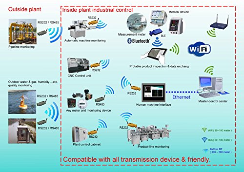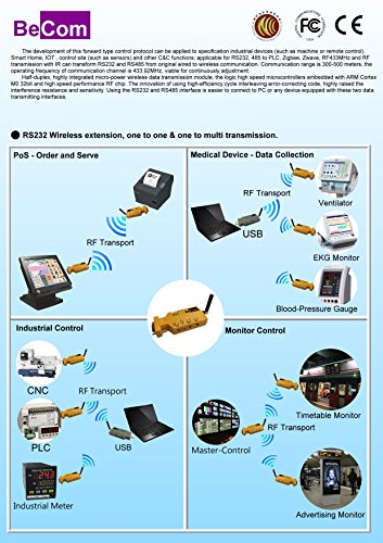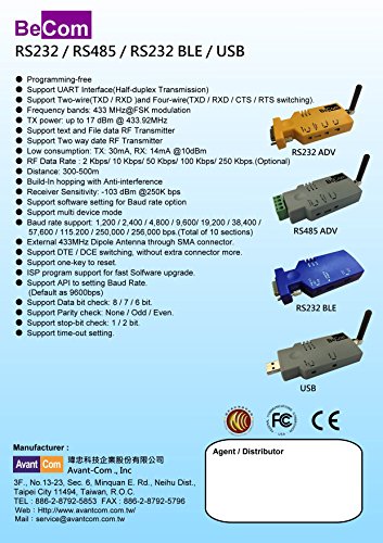 -. Binding : Electronics -. Brand : BeCom -. Color : Rs232/Rs485/USB:Yellow;RS232 BLE:Blue -. EAN : 0662774014937 -. Feature : First And Only One Embedded with ARM Cortex M0 32-bit MCU. / CE / FCC / NCC Certification. / Plug and Play, 1vs1; 1 vs multi device mode. / Transmission Distance: 300~500 Meters. / Buy one get one free (BLE doesn't include), only applicable for the first order. -. Label : AVANT-COM, INC. -. Manufacturer : AVANT-COM, INC. -. Model : ACI-RS232-433-D -. MPN : ACI-RS232-433-D -. PackageQuantity : 1 -. PartNumber : ACI-RS232-433-D -. ProductGroup : Personal Computer -. ProductTypeName : NETWORKING_DEVICE -. Publisher : AVANT-COM, INC. -. Studio : AVANT-COM, INC. -. Title : BeCom Rs232/Rs485/Rs232 Bluetooth Low Energy/USB Wireless Adapter (Antenna included) -. UPC : 662774014937