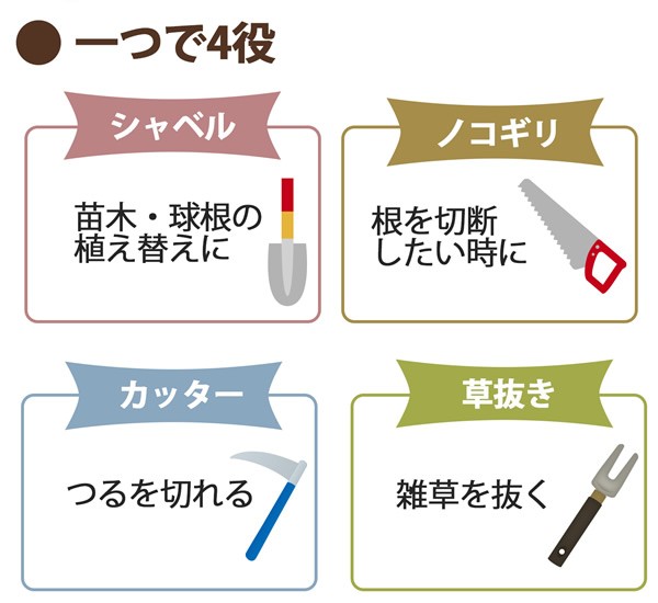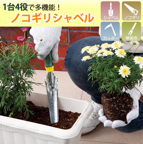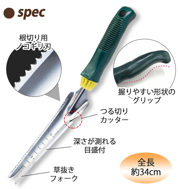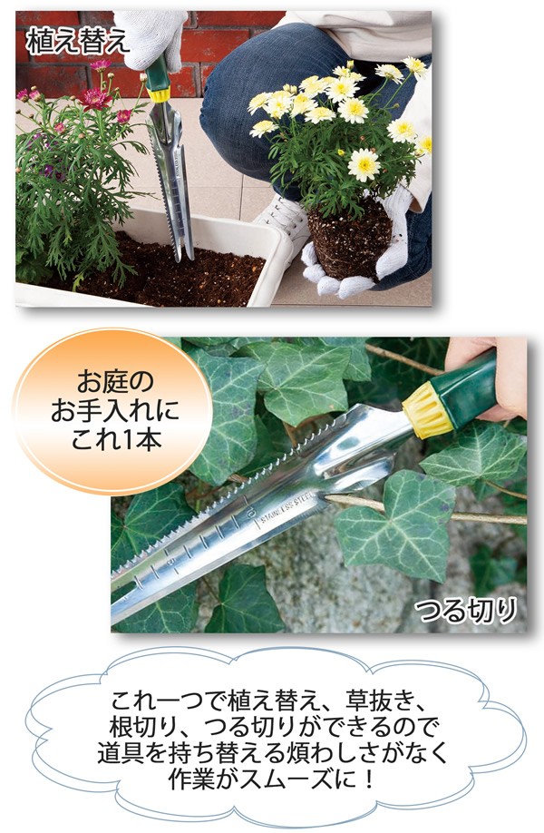 草抜き、植え替え、根切り、つる切りができるガーデニング多機能シャベルです。