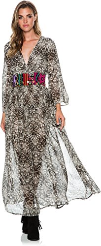 Caftan-inspired maxi dress with flowing sleeves featuring V-neckline and colorful mixed-print waistband with metallic charms