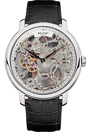 Armbanduhr skelettiert mit mechanischem Handaufzug Uhrwerk im großem Edelstahl Uhrenghäuse von 45mm Made in Germany Ref.: GM1429 Nummer: 11020033 Uhrenmarke Regent Made in Germay 2 Zeiger Uhrwerk Kaliber PTS9211 skelettiert, Stunden- und Minutenzeiger in Lanzenform schwarz lackiert, Edelstahl Uhrengehäuse poliert Gehäusedurchmesser 45mm Wasserdicht 3bar, entspricht 30 Tiefenmetern Saphirglas Mineralglasboden Kalblederband Krokoprägung Minutenskala mit schwarzen Indexen auf weißem Kranz 2 Jahre Garantie auf das Uhrwerk