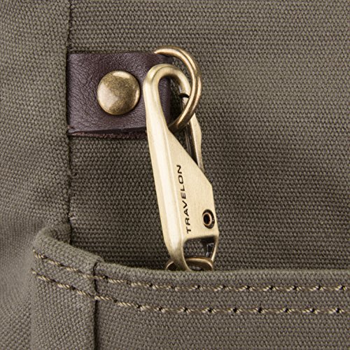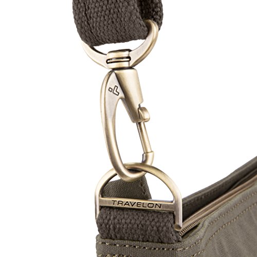 The Travelon Anti-Theft Courier N/S Crossbody is functional as it is fashionable. Travel with confidence and in style. Loaded with Anti-Theft features like a RFID blocking zippered wall pocket, locking zippers, hidden slash resistant stainless steel mesh body panels and stainless steel cable strap that is adjustable and can be secured to a stationary object protecting you from a grab-n-go. It also has two large, deep zippered front pockets; one locks for added security. The rear zip pocket is large enough to carry an iPad¨ or to keep quick-grab items. The mesh expansion pocket is great for a water bottle, umbrella, sunblock or sunglasses and zips conveniently away when not in use. Made with a Cotton/Polyester blend that is water and stain resistant for durability and has a natural feel. Secure never looked so stylish with genuine leather accents an antique brass finished hardware. Wear it two ways, over your shoulder or Crossbody. Go anywhere and everywhere with confidence with the Anti-Theft Courier N/S Crossbody.