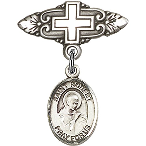 -. Title : Sterling Silver Baby Badge with St. Robert Bellarmine Charm and Badge Pin with Cross 1 X 3/4 inches