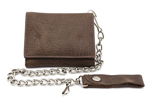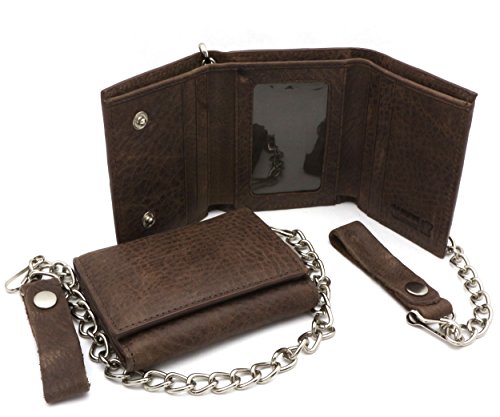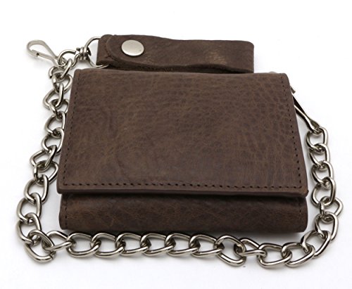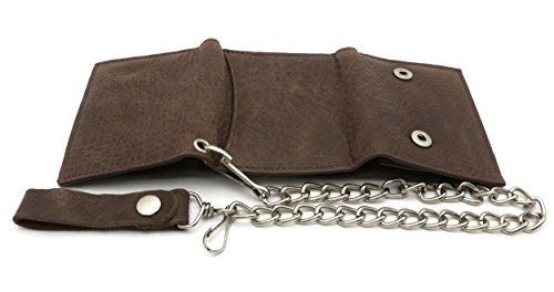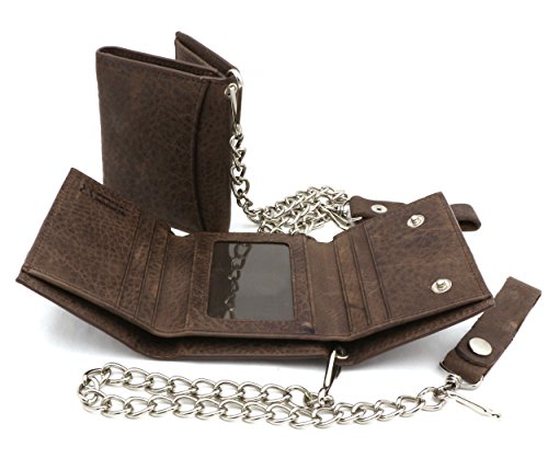 -. Feature : Trifold 11 x 9 cm light brown wallet with chain / Card window / 2 coin pockets / 4 card slots / Outer pocket