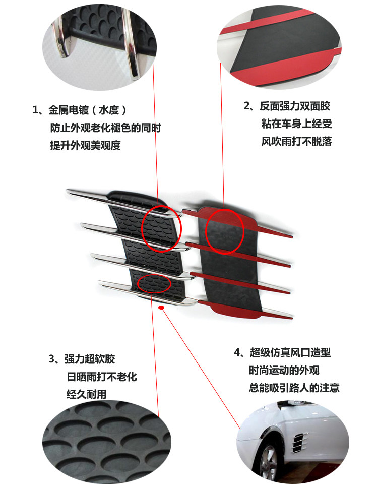 The surface is treated by electroplating, beautiful and durable. Improve the car grade. Using the night laser reflective film, increase the width of the line of sight, from the warning security. Easy to install, select the appropriate location can be affixed. Back with double-sided adhesive.