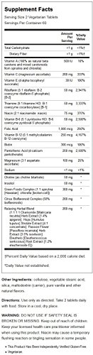 Amount Per Serving% Daily Value***Total CarbohydrateDietary FiberVitamin A (100% as natural beta carotene and mixed carotenoids from spirulina and chlorella)500IU10%Vitamin C (magnesium ascorbate)200mg333%Vitamin E (d-alpha tocopheryl succinate)30 IU100%Riboflavin (5:1 riboflavin : B2 coenzyme riboflavin 5 phosphate) B250 mg294%Thiamine (9:1 thiamine HCl : B1 coenzyme cocarboxylase) B150 mg3333%Niacin (2:1 niacinamide:niacin)75 mg375%Vitamin B6 (5:1 pyridoxine HCl : B6 coenzyme pyridoxal 5 phosphate)50 mg2500%Folic Acid1000 mcg250%Vitamin B12 (5:1 methylcobalamin : B12 coenzyme)250 mcg4167%Biotin300 mcg100%Pantothenic Acid (d-calcium pantothenate)250 mg2500%Magnesium (3:1 aspartate : ascorbate)100 mg25%SodiumCholine (as choline bitartrate)50 mg*Inositol50 mg*Green Foods Complex (1:1 Spirulina (Hawaiian) : Chlorella Chlorella broken cell)300 mg*Citrus Bioflavonoid Complex (50% bioflavonoids)200 mg*Relaxing Herbal Blend (1:1:1:1 Chamomile flower (Matricaria recutita) Herb Extract 1.4% apigenin: Hops Humulus lupulus Strobile Extract (4:1 concentrate): Passion Flower Passiflora incarnata Herb Extract 3.5% isovitexine: Eleuthero (Eleutherococcus senticosus) Root Extract 1.2% eleutheroside E)200 mg*