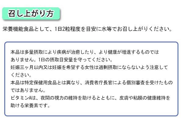 | 栄養成分 | 【2粒500mgあたり】 エネルギー:1.920kcal、たんぱく質:0.008g、脂質:0.013g、炭水化物:0.445g、食塩相当量:0.00015g、ビタミンA:250μg 【主要成分及びその他配合量(2粒500mgあたり)】 ビルベリーエキス末:50mg、カシス抽出物:50mg |