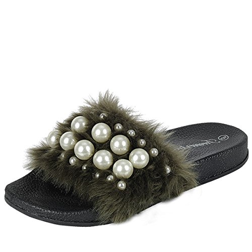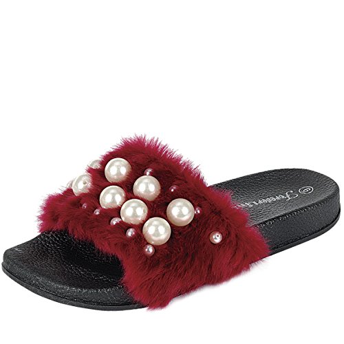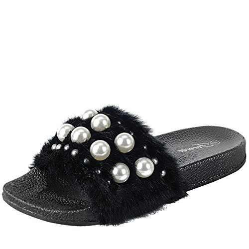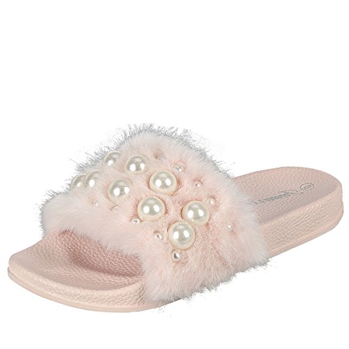Binding : Apparel Product Description Introducing a slide you won't be able to take your eyes off! Team them with relaxed denim-cami-combo, and watch your look become cooler in a hot second before your eyes! This furry sandal features a soft faux fur band with multi-size pearly beads accent, open toe, and molded cushioned footbed for comfort. 0