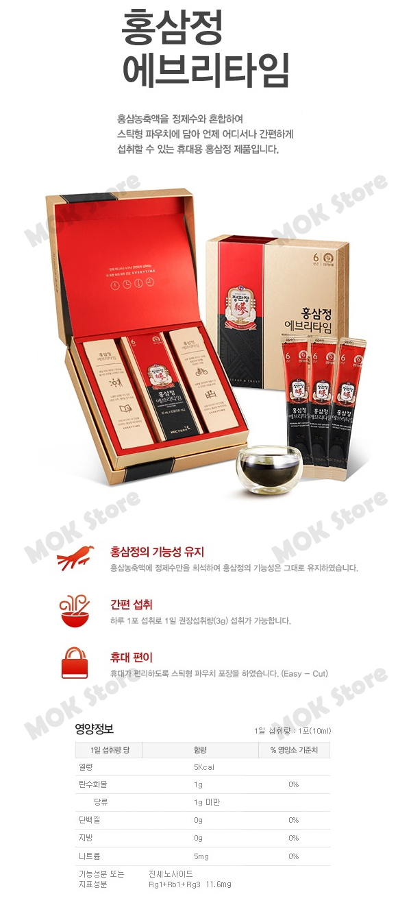 100% Korean red ginseng extract is mixed with purified water and coveniently packaged in stick pouch for easy portability. Each pouch contains daily recommended dose of Korean red ginseng(3g) with all the active ingredients preserved.