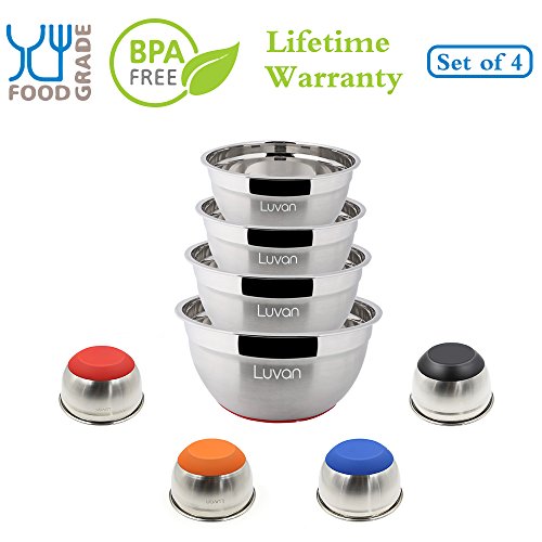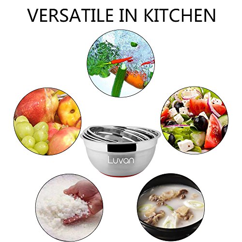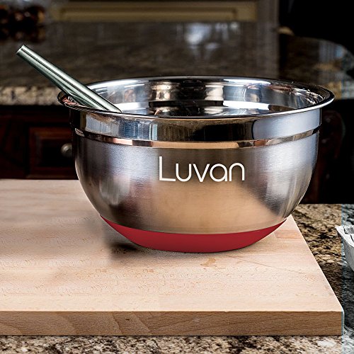 "Luvan" is new brand focusing on Home Kitchen, along with top-notch domestic manufacturers, providing our customers with excellent products and services. Lifetime no hassle warranty Made of 18/10 304 FDA-Approved Polished stainless steel and BPA free silicone bottom FDA test report number is SZC17051587971 With graduating sizes of 2.5, 3.0, 4.0,and 5.0 quart Easily stackable for minimal storage and volume measurements stamped inside. Sturdy, rust-resistant, deform-resistant, durable, refrigerator, freezer, and dishwasher safe, rim of the bowl rolled VERSATILE: can be used as whisking eggs bowls, cake mixtures bowls, storage bowls, fruit bowls, popcorn bowls, serving bowls, salad bowls, ingredient bowls, cereal bowls, cookie bowls. Dimensions: Bowl 1 - Diameter 7.08" - 2.5 Quart Bowl 2 - Diameter 7.87" - 3 Quart Bowl 3 - Diameter 8.66" - 4 Quart Bowl 4 - Diameter 10" - 5 Quart Notices: It's not for microwave or oven 0 |