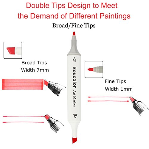 - DUAL TIP MARKERS - Broad Tip: For filling in large spaces and blending colors together. Fine Tip: For detailed outlining and fine lines. Many artists love to use our dual tipped marker pens because of their accurate line control, superior color blending and the flexibility of a smooth pen stroke. Clean thick or thin lines can be achieved with ease.