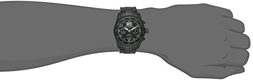 -. Feature : Black radiant dial with chronograph feature and date display window at 12 o'clock / Embossed Arabic numerals with luminescent filled silver tone leaf style hour and minute hands / Black stainless steel case with brushed black link bracelet / Chronograph quartz movement with analog display / Water-resistant to 30 M (100 feet)