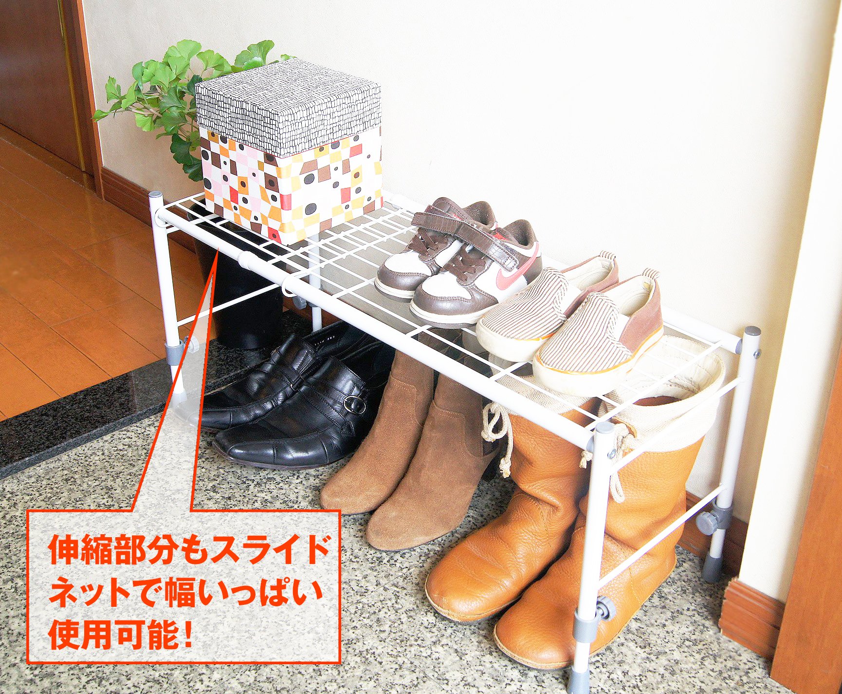 It is a storage shelf of slim type that can be laterally stretchable perfect for organizing dead space such as closet and closet.