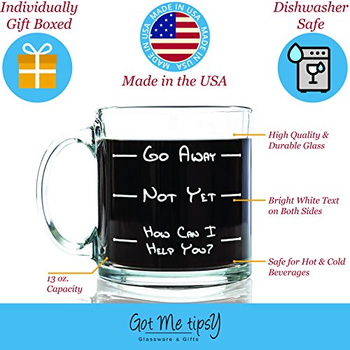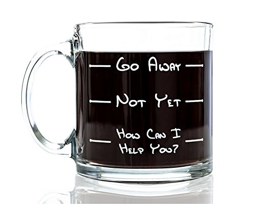 - Feature : MAKE A STATEMENT - Tell everyone to "Go Away" until after you've had your cup of coffee. Relax and enjoy some peace and quiet until you're ready to start the day with this large 13oz Microwave & Dishwasher safe glass mug. / A GIFT THEY'LL LOVE - Imagine the look on their face when they open the gift box and find their new favorite coffee mug. They'll know you put in the extra effort to find something WAY better than a typical cheap ceramic mug. A perfect gift for both men and women. / HIGH QUALITY - This perfectly sized 13 oz glass mug is made in the USA. It's microwave and dishwasher safe, with text printed on both sides. The custom imprinted text is guaranteed to last. The unique & funny text is bright white and can be seen from afar. This mug is nicely oversized. / SPECIAL OCCASIONS - This clear glass mug is a cool gift idea for a coffee or tea lover. It's one of the best Valentine's Day gifts for your wife, husband, girlfriend, boyfriend, Mom, Dad, Grandma or Grandpa. Perfect for him or her on their birthday or even as a humorous gift for your brother or sister. A sarcasm infused gag gift for your boss or coworkers who don't like being disturbed at the office. Have a son or daughter who loves coffee? The kids will appreciate your sense of humor. / SATISFACTION GUARANTEED - Check out all of the great reviews below to see what others think of this mug. Simply the best novelty mug on Amazon. We guarantee your satisfaction.