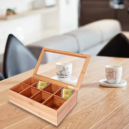 Studio : Q Technologies Publisher : Q Technologies Product Description Everything Bamboo Wooden Tea Bag, Condiment or Small Accessories Storage Organizer Caddy with Clear Lid 8 Compartments. Secure Portable Storage - Strong magnetic closure holds lid securely closed for stable moving storing. Finger indentation allows you to open the box quickly easily. Made from High Quality 100% Natural Bamboo; not only is it tough durable, it is perfect for the storage of tea having natural antibacterial properties. Eight equally divided compartments make it easy for you to sort, store select your entire range of teas (each compartment measures 2 6/8" x 3 1/4") Attractive design featuring an accent line as well as an elegant looking hinged acrylic lid allowing you to not only store but display your contents. Multipurpose organizational display box can be used to store not only tea but condiments any small accessories you wish. Also makes a great gift for any home! 0