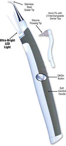 Studio : Spark Innovators Corp Publisher : Spark Innovators Corp Binding : Misc. Product Description Special Offer - 2 Pack - Sonic Pic Gentle at Home Dental Cleaning System! Sonic Pic is the gentle and easy way to remove plaque and tartar, saving you trips to the dentist. Sonic Pic uses gentle sonic vibrations to remove stains and buildup, giving you whiter teeth and healthier gums. As a bonus, you'll receive the silicone flossing tip free. Sonic Pic is safe for use on implants, crowns and veneers. Uses 1 AAA battery (Not Inlcuded) 0