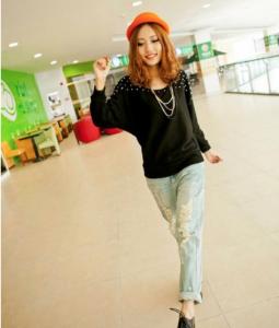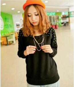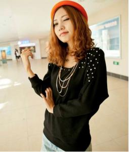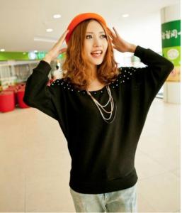 "ゆったり カットソー 長袖 ドルマンスリーブ パール ビジュー カジュアル Uネック 鎖骨見え 秋冬 トップス プルオーバー