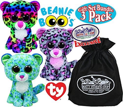 -. Feature : Gift Set Bundle Includes 3 Awesome Beanie Boo Leopards! Leona, Dotty & Tasha! / Leona (Blue Leopard) - For I am the prettiest cat With bright green eyes and spots to match! - Dotty (Multi-color Leopard) - Awesomely crazy colors on me! - Tasha (Pink & Grey Leopard) - You'll not see me during the day Because my spots help me to hide away. / Official products from Ty's wildly popular Beanie Boos Collection, handmade of polyester fibers plastic pellets. Beanie Boos are approx. 6" Tall/Long and are made of the highest quality materials! / Makes a great gift & is perfect for schools, party favors, stocking stuffers, baskets, camps, special needs, collectibles and so much more! / For Ages 3 and up - Fun for the whole family! - Matty's Toy Stop exclusive storage bag included!