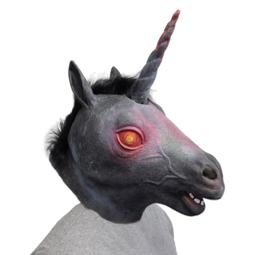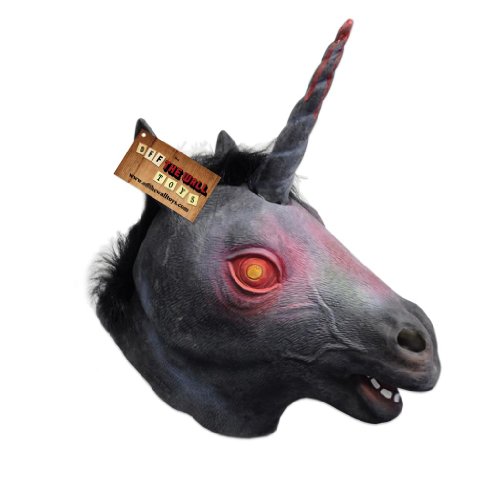 Other people love the Unicorn Mask, but you are a little bit different. Your heart stirs to the darker side. No white face with crystal blue eyes will stir your emotions. No... you have a darker side. No rainbows and dewdrops in your future. For the person with an attitude we've made the EVIL Unicorn mask just for you. It's the same as our bestselling unicorn mask, except the horn and mane are as black as your soul. How do you see you ask? Why... through the Evil Unicorn's mouth and the nose holes of course. Made from eco-friendly latex. This product may have a strong smell of latex, letting the mask air out in a well ventilated place for a day will help. Fits most adult heads. Allergy warning: If you are allergic to latex, don't wear this. Made exclusively for Off the Wall Toys. Bagged with illustrated Off the Walls tag. To ensure it's the real deal please look for the Off the Wall Toys label.Feature