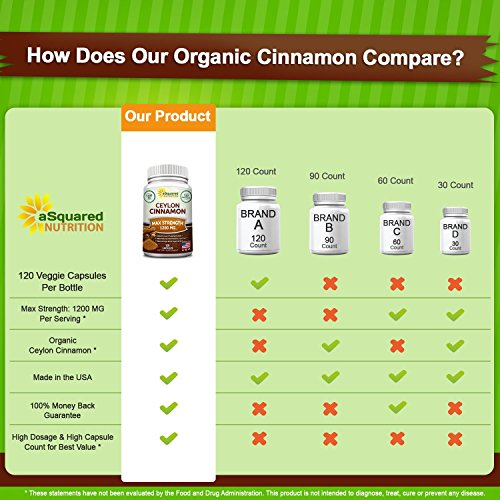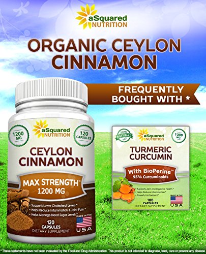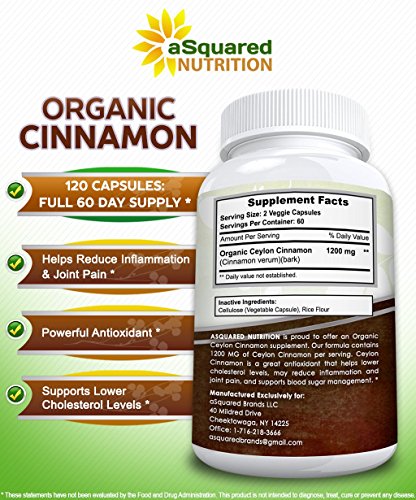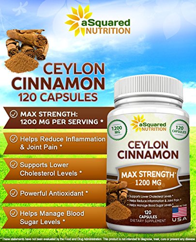 -. Binding : Health and Beauty -. Brand : aSquared Nutrition -. EAN : 0641799787477 -. Feature : ORGANIC & EFFECTIVE: Our 100% Organic Ceylon Cinnamon is vegetarian safe and non-GMO. Ceylon Cinnamon helps reduce inflammation and joint pain, supports lower cholesterol levels and helps manage blood sugar levels. As an added benefit, Ceylon Cinnamon is a powerful antioxidant. * / NATIVE TO SRI LANKA: Ceylon Cinnamon is often referred to as "true cinnamon," or Cinnamomum verum bark, is native to Sri Lanka, where it naturally and organically grows. It is light brown in appearance, has a soft texture and sweet aromatic, and has multiple folds of layer. Most important, it is much safer, higher quality and more expensive than common cassia cinnamon. * / BEST VALUE AVAILABLE ON AMAZON: Backed by our 100% Money Back Guarantee, you receive 120 maximum strength veggie capsules for a full 60 day supply. Each capsule contains 600mg of 100% Organic Ceylon Cinnamon delivering a total of 1200mg per serving (other brands offer only 500 or 1000mg). Our product is manufactured right here in the USA, and is manufactured according to current Good Manufacturing Processes (cGMP). * / SAFER THAN CASSIA CINNAMON: Cassia Cinnamon, also known as common cinnamon, contains high levels of Coumarin content, which may be toxic when taken in large doses for prolonged periods of time. For this reason, it is very important to look for Organic Ceylon Cinnamon to suffice your cinnamon supplement needs. * / CONVENIENT VEGGIE CAPSULES: Our Organic Ceylon Cinnamon is packaged in vegetable capsules for easy swallowing. You get 120 capsules per bottle and 600 MG of Ceylon Cinnamon per capsule (1200 MG per serving). * Enjoy this supplement combined with other popular aSquared Nutrition products such as Turmeric Curcumin, Thyroid Support, and Green Coffee Bean. -. IsAdultProduct : 0 -. Label : aSquared Brands -. LegalDisclaimer : These Statements have not been evaluated by the Food and Drug Administration. This Product is not intended to diagnose, treat, cure or prevent any disease. -. Manufacturer : aSquared Brands -. MPN : aSquaredCinnamon -. PackageQuantity : 1 -. PartNumber : aSquaredCinnamon -. ProductGroup : Health and Beauty -. ProductTypeName : HEALTH_PERSONAL_CARE -. Publisher : aSquared Brands -. Studio : aSquared Brands -. Title : Pure Organic Ceylon Cinnamon 1200mg - 120 Capsules, True Cinnamon from Sri Lanka, Extract Supplement Pills Promote Heart Health, Weight Loss, Lower Blood Sugar Levels, Reduce Inflammation Joint Pain -. UPC : 641799787477