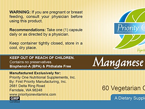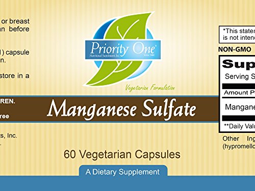 -. Binding : Health and Beauty -. Brand : P.R.Iority One Vitamins -. EAN : 0815354020938 -. Feature : Mineral supplementation for healthy connective tissue and strong bones* / Natural Ingredients. Natural formula. This product is non-GMO and gluten free. Made in USA at FDA cGMP Registered Facility. -. IsAdultProduct : 0 -. Label : P.R.Iority One Nutritional Supplements Inc./First P.R.Iority Manufacturing Inc. -. Manufacturer : P.R.Iority One Nutritional Supplements Inc./First P.R.Iority Manufacturing Inc. -. MPN : 1675 -. PackageQuantity : 1 -. PartNumber : 1675 -. ProductGroup : Health and Beauty -. ProductTypeName : HEALTH_PERSONAL_CARE -. Publisher : P.R.Iority One Nutritional Supplements Inc./First P.R.Iority Manufacturing Inc. -. Studio : P.R.Iority One Nutritional Supplements Inc./First P.R.Iority Manufacturing Inc. -. Title : P.R.Iority One Vitamins Manganese Sulfate 60 Vegetarian Capsules - Essential Mineral - Healthy Nervous System.* -. UPC : 815354020938