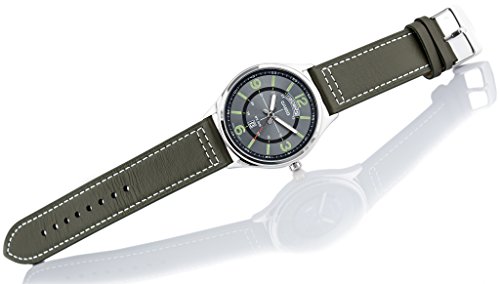 -. Feature : Case / bezel: Ion plated / Leather Band - Mineral Glass / 50M Water Resistant / Size of case : 52.5×45×9.5mm / Dark Green Band - Silver Dial