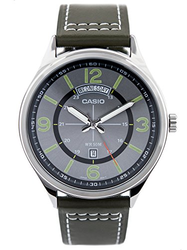 -. Title : Casio Men's Dk Green Leather Modern Dial Watch Day/Date MTP-E129L-3AV