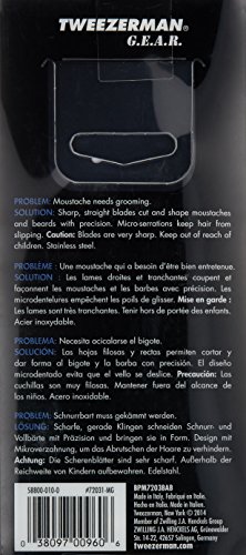 ReleaseDate : 2014-01-22 Studio : Tweezerman Publisher : Tweezerman Binding : Health and Beauty Product Description For good grooming. Sharp, straight blades cut and shape moustaches and beards with precision. Micro serrations keep hair from slipping. Stainless steel. 0