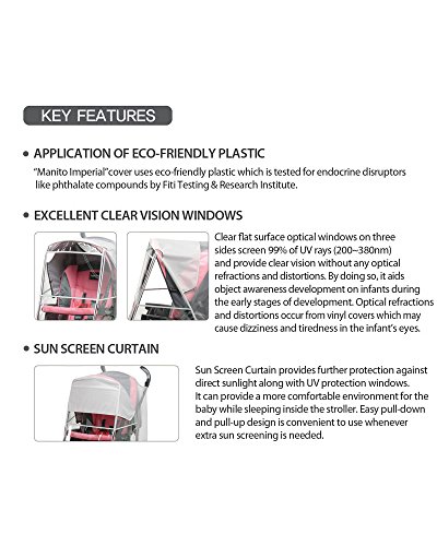 Manito Imperial Stroller Weather Shield is the upgrade model of Essence Stroller Cover featuring larger front window with two additional windows on the sides.