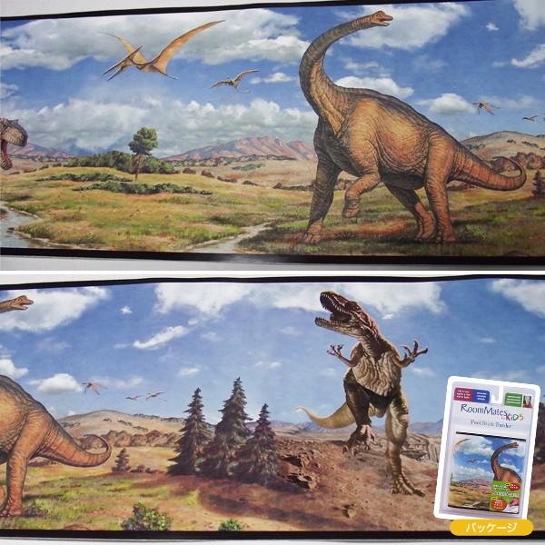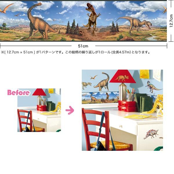 お部屋がジュラシックパークに…。今にも叫び声が聞こえてきそうな、リアルタッチの恐竜がモチーフのスクロールタイプのステッカーです。同じモチーフのステッカーとの組み合わせもおススメです。 繰り返しの絵柄が続くロールタイプなので、とっても簡単にお部屋の模様替えや汚れ隠しなどにお使いいただけます。こども部屋やバスルームなど、お好みの場所でお楽しみ下さい。 ★商品名★ダイナソー(ボーダー)★商品番号★RMK1042BCS★内容★1ロール(全長4.57m)/1パック