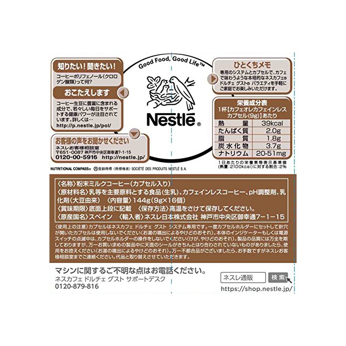 원본상품명: ネスカフェ ドルチェ グスト用カプセル カフェオレ カフェインレス16P