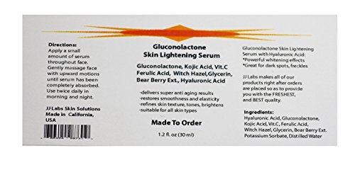 -. Feature : Made to Order! We make all of our products right after they are placed so as to provide you with the FRESHEST and best quality serums! / Our Skin Lightening Serum with Gluconolactone, Kojic Acid, and Hyaluronic Acid reduces the appearance of dark spots and blemishes to give you a more youthful and even complexion while also providing many anti aging benefits! / Our Skin Lightening Serum with Gluconolactone, Kojic Acid, and Hyaluronic Acid is great for ALL skin types, including dry and sensitive skin!