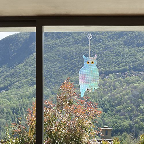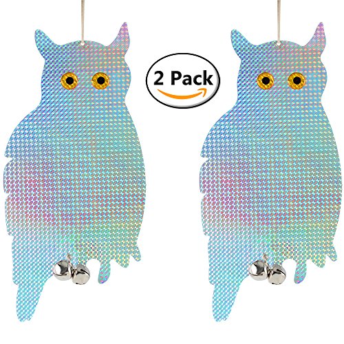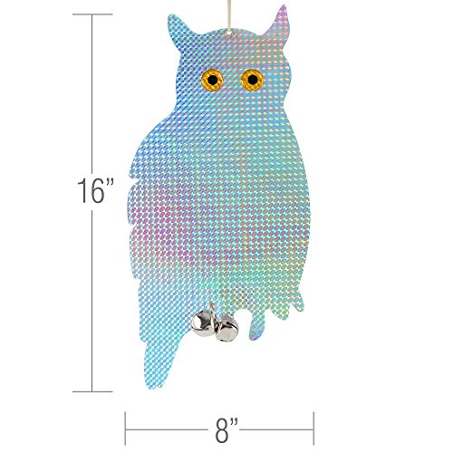 -. Feature : 16 inch Hanging Owl creates bright flashes of light scaring birds and pests / Hang anywhere birds are a problem. Gardens, Patios, Outdoors / Diamond pattern emits reflections alerting birds of danger in the area / Hanging bells produce sound deterrent for animals not scared by light / Package contains 2 Owls