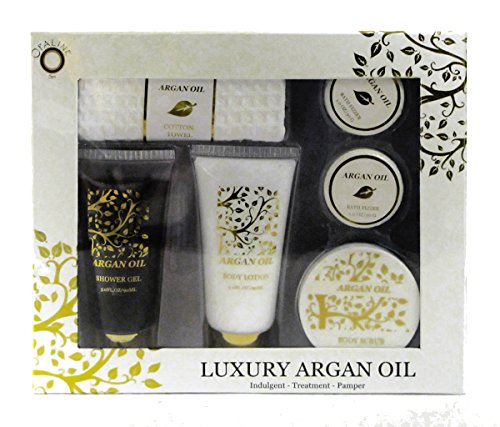 Luxury Argan Oil Bath Spa Set Shower Gel Body Lotion Scrub 2 Bath Fizzers 1 Waffle Face Towel