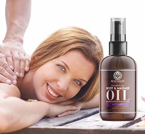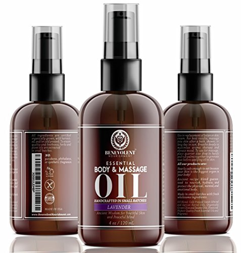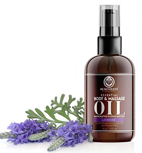 Healing Essential Body and Massage Oil From Benevolent Nourishment. Handcrafted 100% Natural Skin Care to Nourish Your Body and Mind. Lavender,best Relaxing Aromatherapy with Daily Moisturizer HIGHEST QUALITY- 100% Natural and Organic cold pressed Sweet Almond and Apricot Kernel oils, organically grown Olive and Sesame oils. Finest and best Lavender Essential oil and fragrance. Handcrafted in small batches to ensure quality and freshness. GOOD MOISTURIZER- for whole body all day and night. Soaks into skin fast, immediately hydrating your skin. Aromatic scent will relax your mind and soul. GREAT 4oz BOTTLE with pump applicator makes it easy to control the amount of oil desired. 100% MONEY BACK Guarantee- If you are not satisfied with our oil we will refund your money!