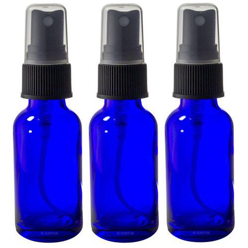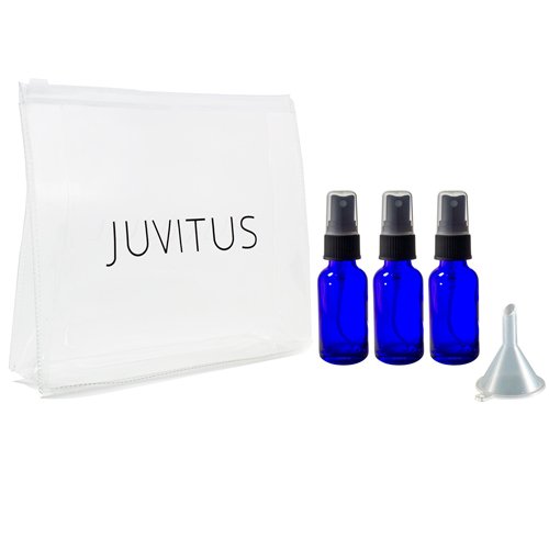 Cobalt Blue Glass Boston Round Spray Mister Bottle Kit - 3 Bottles (1 oz) + Clear Travel Bag and A Funnel for Aromatherapy, Essential Oils, DIY, Perfume, Home and Travel