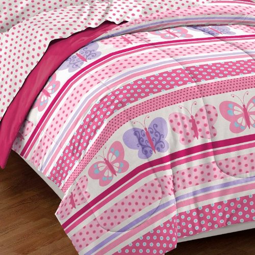 - Feature : Fluttering butterflies comforter set in pink, purple, blue and white / Twin set includes: comforter, one standard sham, flat sheet, fitted sheet and one standard pillowcase / Ultra soft microfiber fabric; machine washable