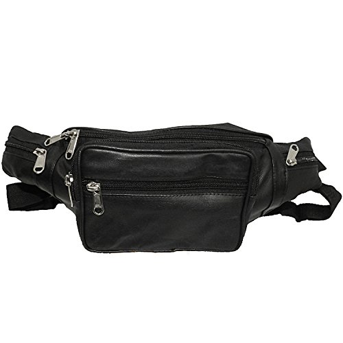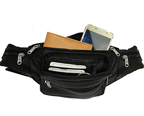 -. Feature : Made of Soft Lambskin Leather, Plenty of storage space (5 zipper compartments including 1 concealed netted bottle holder compartment and 1 organizer compartment, with three credit card slots & 1 Key ring / Come with 1 Small concealed zippered water bottle holder 1 Small side zipper pocket. 1 Front zippered organizer, w/3 CC slots & 1 Key ring 1 Large front zipper pocket 1 Back zipper pocket. / Perfect for everyday use, outdoor activities, or travel, Adjustable up to 50" Waist, Medium -sized fanny pack - Dimensions (LxHxW): 14.5 in x 6 in x 4.5 in. / Adjustable nylon waistband with plastic clasp closure fits up 54" waist Dimensions (LxHxW): 14.5 in x 6 in x 4.5 in