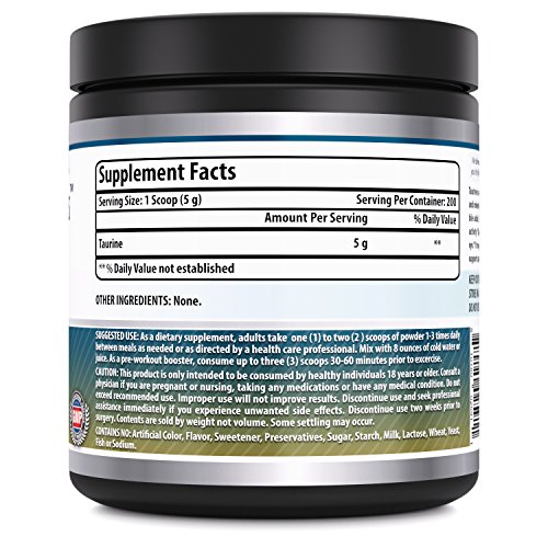 -. Feature : • POTENT, PURE TAURINE Amazing Nutrition Taurine Dietary Supplement powder contains 100% Pure Taurine with No Fillers Of Any Kind, No Preservatives, No Artificial Flavors Or Sweeteners, Making It The Best Way To Truly Benefit From The Amino Acid Taurine / • TAURINE BENEFITS Taurine is an amino acid that supports neurological development and helps regulate the level of water and mineral salts in the blood. As a key constituent of bile acids, it may help the body absorb nutrients with greater ease while moderating healthy cellular activity. Taurine promote energy production which help to improve athletic performance and is vital for long workout sessions.* / • EXTRA STRENGTH Our Taurine powder offers a whopping 5000 mg of pure taurine in every serving. Every jar contains approximately 200 servings! / • QUALITY YOU CAN TRUST All Amazing Nutrition products are manufactured in accordance with Good Manufacturing Practices (GMP), among the highest standards in the world. / • PURITY & POTENCY All our products are proudly made in USA with Guaranteed Purity & Potency. We offer best quality products for the best value. All our products are Third Party Tested. We do not compromise on quality.