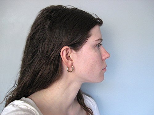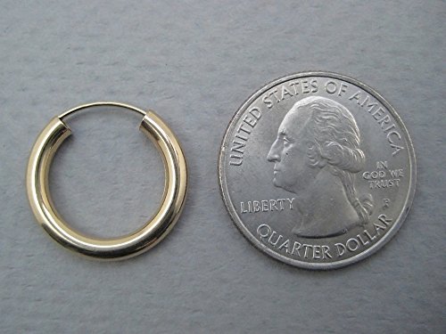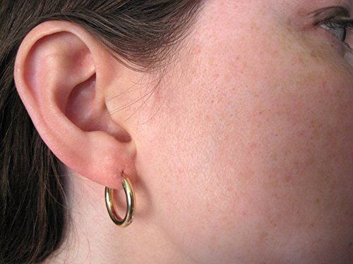 These small thick yellow gold hoop earrings are big, bold, and powerful. They may be just 19mm in length, but with their 3mm wide tube, these hoops are sure to be eye catching. Dress them up, or dress them down, the continuous endless streamlined design is extremely versatile. And though they may look big, a hollow body makes for easy, comfortable wear all day and night. Each pair of hoop earrings comes gift wrapped in an attractive package.Because of the thickness of this earring, it may initially be difficult to put on. Please compare the size of these earrings to your earlobe to ensure they are the right size for you.