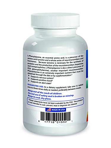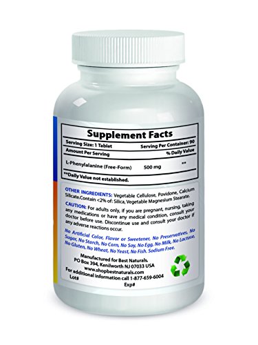 -. Binding : Health and Beauty -. Brand : Best Naturals -. Feature : Nervous system supports / Pro-Neurotransmitter / Promotes positive mood / Supports and alert state / All Best Naturals products are manufactured in accordance with Good Manufacturing Practices (GMP), among the highest standards in the world -- Proudly Made in USA -- Purity & Potency Guaranteed -. IsAdultProduct : 0 -. Label : Best Naturals -. Manufacturer : Best Naturals -. MPN : 8177165015521 -. PackageQuantity : 1 -. PartNumber : 8177165015521 -. ProductGroup : Health and Beauty -. ProductTypeName : HEALTH_PERSONAL_CARE -. Publisher : Best Naturals -. Studio : Best Naturals -. Title : Best Naturals L-Phenylalanine 500 mg 90 Tablets